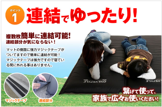 マットの両端には連結用のマジックテープが付いており、複数枚を簡単に連結できます。2枚並べれば車内が広々ダブルベッドのようになり、夫婦やカップル、親子での車中泊にも最適です。
