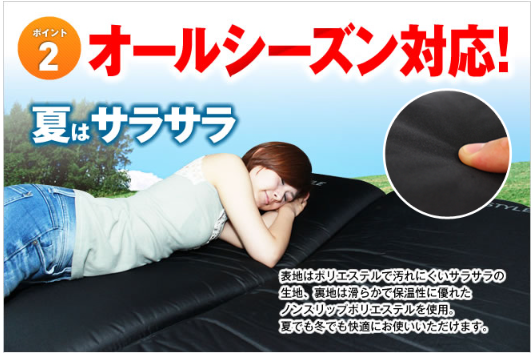 マットの両端には連結用のマジックテープが付いており、複数枚を簡単に連結できます。2枚並べれば車内が広々ダブルベッドのようになり、夫婦やカップル、親子での車中泊にも最適です。